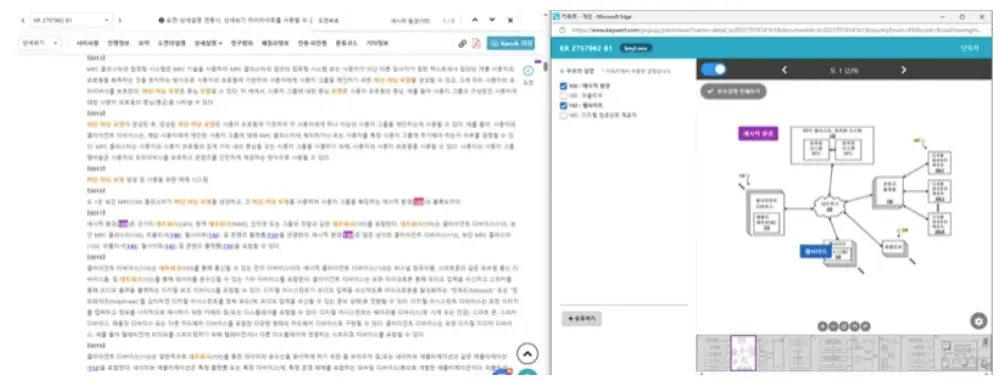 특허를 검토 할 땐 상세한 설명과 청구항, 도면을 비교하며 다각적으로 검토해야 하는데요! 명세서를 출력하여 상세한 설명이나 청구항, 도면을 나란히 놓고 도면에 상세한 설명에 나오는 내용들을 표시하면서 검토하거나, 듀얼 모니터에 상세한 설명이나 청구항, 도면을 각각의 모니터에 표시한 후 검토했는데 시간이 많이 소요될 뿐만 아니라 매우 번거로웠습니다.