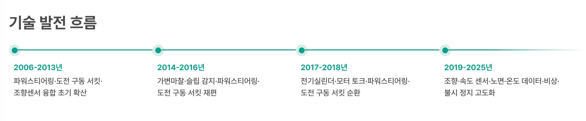 2019 ~ 2025년 : 노면·온도·속도 데이터 수집, 비상 상황 대응, 환경 인지 기반 적응형 제어로 고도화