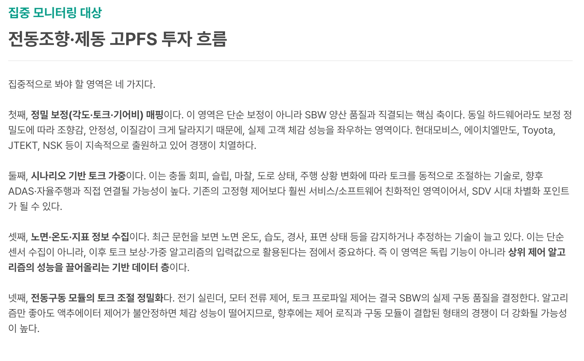 도로 상태, 주행 상황에 따라 토크를 동적으로 조절하는 기술입니다. ADAS·자율주행과 연결될 가능성이 높은 기술로, SDV 시대의 차별화 포인트로 부상할 수 있다는 시각도 있습니다.