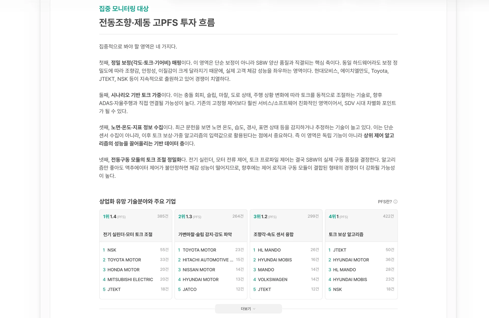 특허 데이터를 보면 기본 토크 보상은 이미 성숙 단계로 접어든 것으로 보입니다. 출원 흐름을 근거로 하면, 다음 경쟁이 환경을 읽고 스스로 판단하는 적응형 제어 쪽으로 이동하고 있을 가능성이 있어 보입니다.