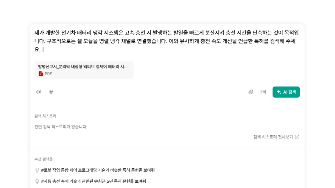 자연어로 기술 설명만 입력하면 AI가 유사 특허 1,000건을 선별하고 사용자 의도와 문헌 내용을 해석하여 바로 검색결과 요약 및 정리