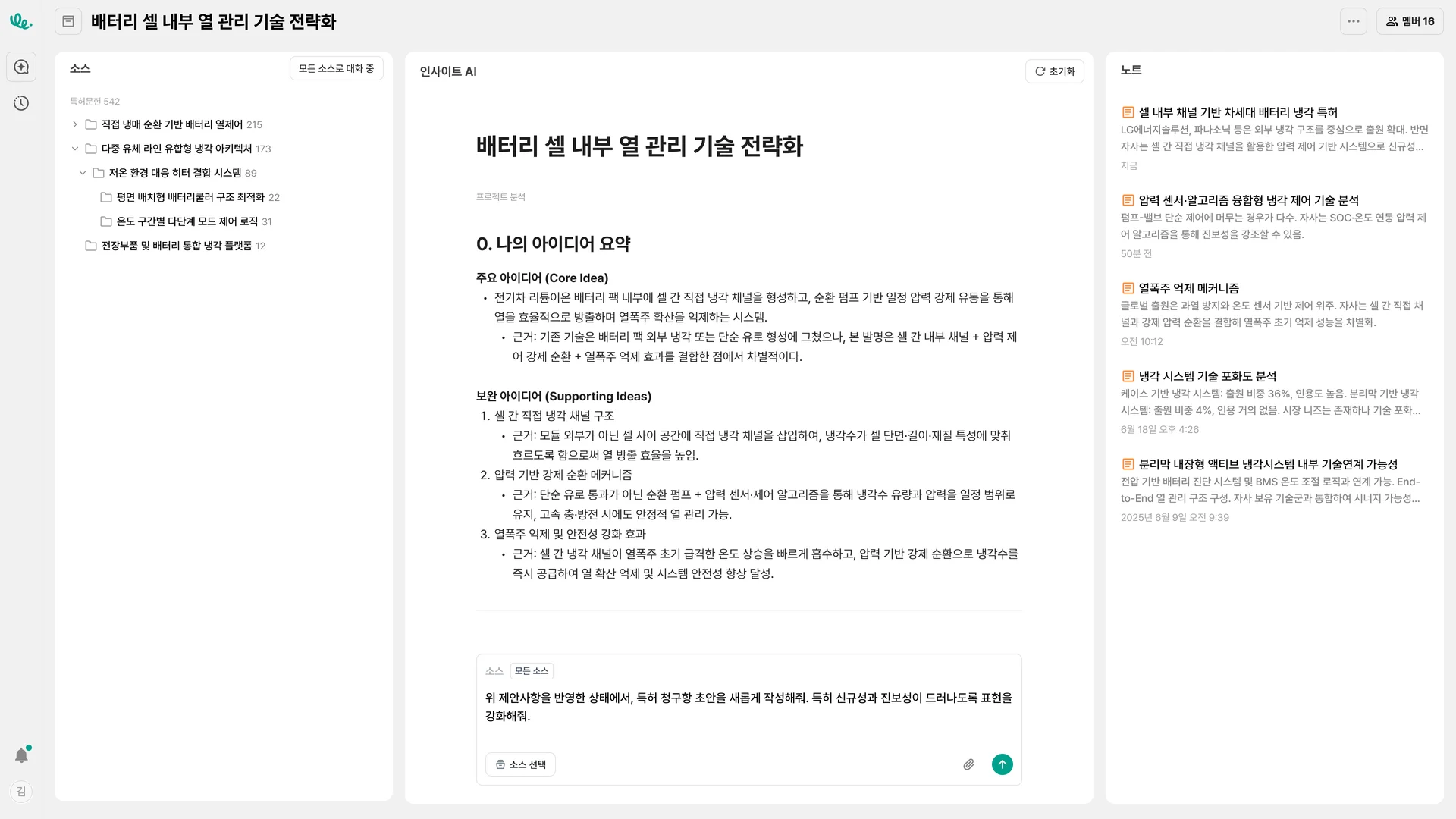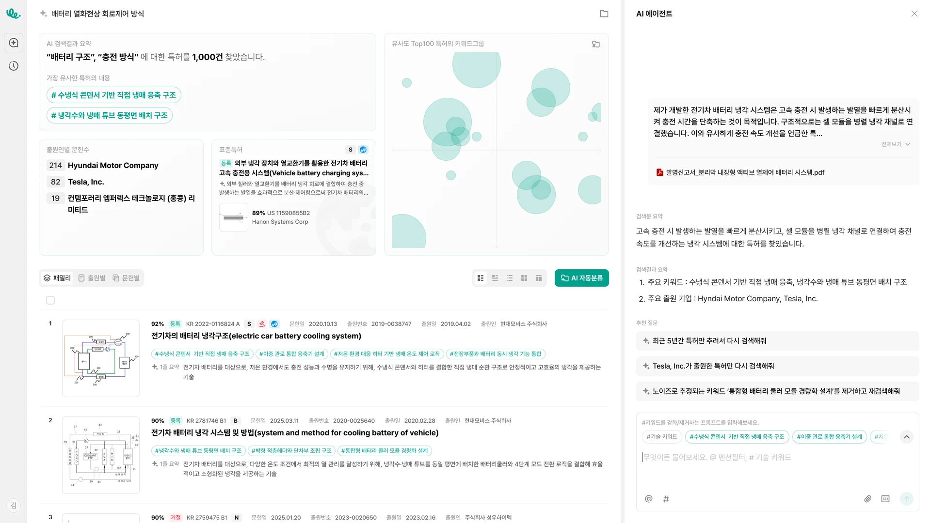 업무 목적: 우리가 개발 중인 '전기차 배터리 냉각 시스템'과 유사한 특허를 찾아서 각 특허 대비 우리 기술의 차별점을 도출하여 아이디어를 고도화하고, 이를 바탕으로 명세서 초안을 AI를 활용해 작성하는 업무
