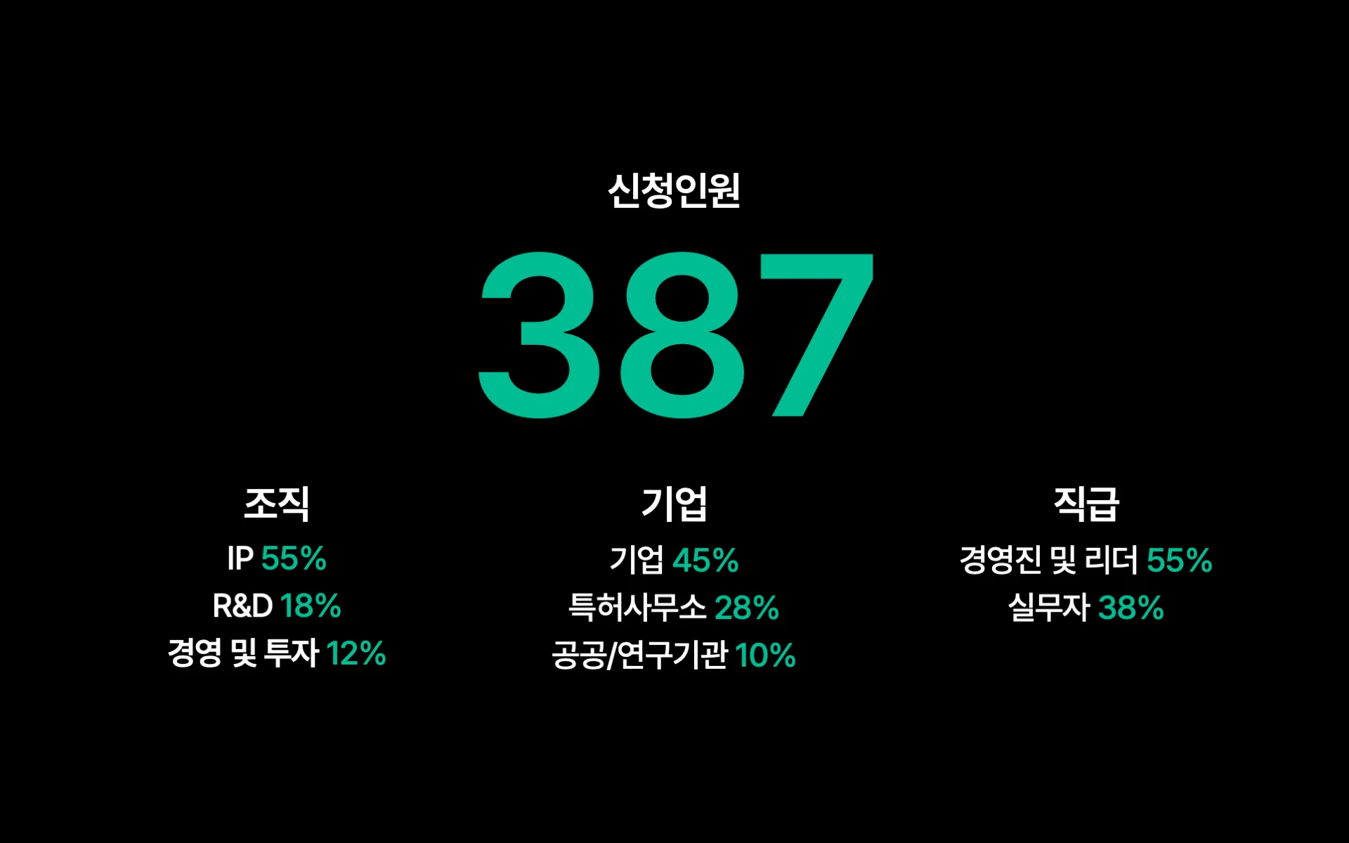 이번 행사는 AI Native Research라는 새로운 특허 리서치 패러다임을 소개하는 자리였습니다. 주요 기업의 IP 및 R&D 리더, 국내 로펌과 특허 전문기관의 대표들이 참석해 키워트 인사이트의 출발을 축하했습니다. 총 387명의 참석자가 함께하며 깊이 있는 인사이트와 경험을 나눴습니다.