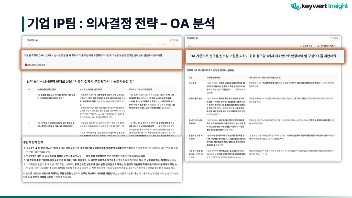개별 기능(명세서 작성, 분류 등) 특화 솔루션들과 달리, 키워트 인사이트는 IP 업무 전체 플로우(End-to-End)를 커버합니다. 10년간 축적된 특허 DB와 전처리 노하우, LG AI 연구원 공동 개발, 딥엘(DeepL)과의 글로벌 파트너십, 리벨리온 AI 칩 기반 온프레미스 공급 등 폭넓은 레퍼런스가 기반입니다.