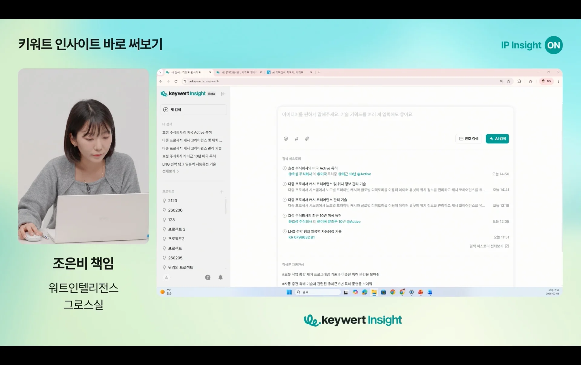 이번 'IP Insight ON' 웨비나는 단순한 제품 소개를 넘어, 특허 업무의 AI 전환이 실제로 어떤 모습이어야 하는지를 구체적인 사례와 시연으로 보여준 자리였습니다. 키워트 인사이트가 제시하는 핵심 가치는 명확합니다. 반복 작업은 AI가 처리하고, 사람은 판단과 전략에 집중하는 것입니다. 그 결과 조직 전체의 IP 업무 생산성이 최소 40% 이상 향상될 수 있다는 것이 베타 기간의 실측 결과입니다. IP Insight ON 시리즈는 연중 정기 웨비나로 계속됩니다. 이론을 넘어 실제 업무에 적용 가능한 구조를 직접 만들고 싶다면 키워트 인사이트를 시작해보세요.
