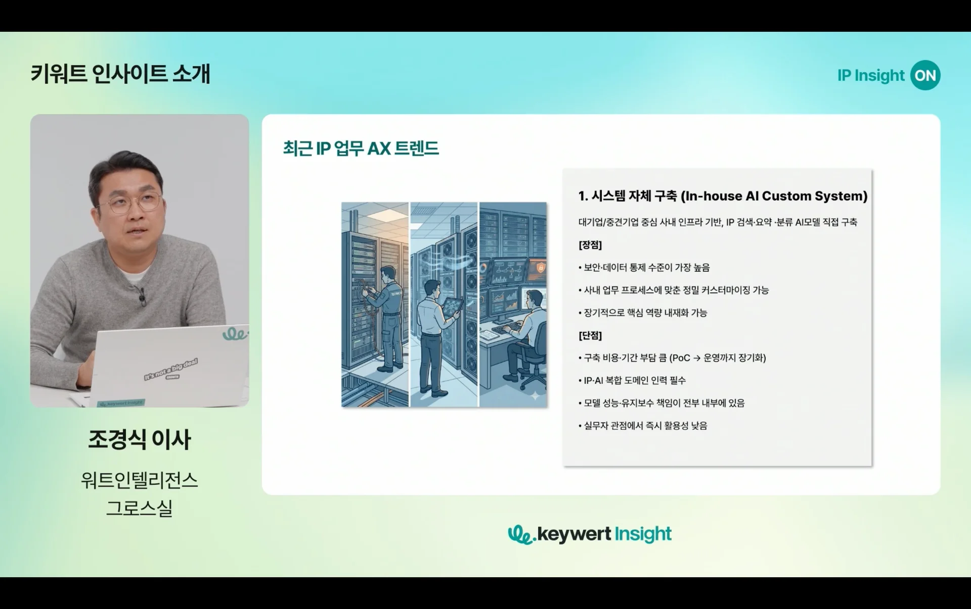 키워트 인사이트는 세 번째 방식인 특허 특화 SaaS AI로, 구축 부담 없이 계정 하나만으로 IP 업무의 AI 전환을 시작할 수 있습니다.