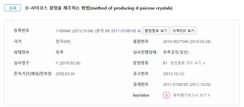 그럼 CJ 제일제당의 대체당 관련 특허를 알아보겠습니다. 이번에 소개할 특허는 키밸류에서 S등급을 받은 중요한 특허입니다. 바로 KR 2011-0108185 A(D-코스 결정을 제조하는 방법)인데요, 키워트 특허검색으로 살펴보겠습니다.