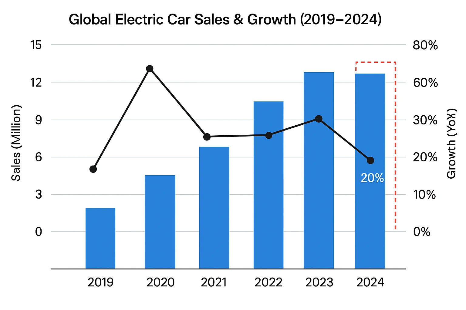 2024년, 전기차 시장에 이상 기류가 감지되었습니다. 고속 성장을 이어오던 글로벌 전기차 시장은 2024년 들어 성장률이 20% 수준으로 떨어졌고, 업계에서는 이를 '전기차 캐즘'이라 부릅니다.