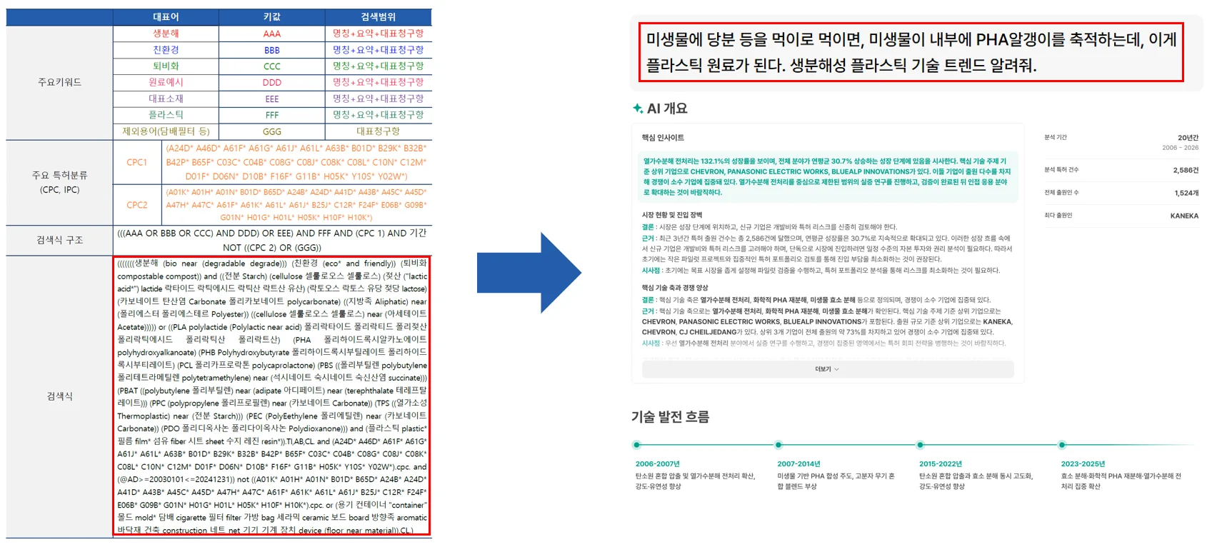 최근에 전쟁으로 생분해성 플라스틱(Bio-degradable Plastics) 기술에 관심이 생겨서 키워트 인사이트로 찾아봤습니다. 기존에는 복잡한 검색식을 작성해야 했지만, 키워트인사이트는 자연어로 편하고 빠르게 기술 트렌드를 파악할 수 있어요.