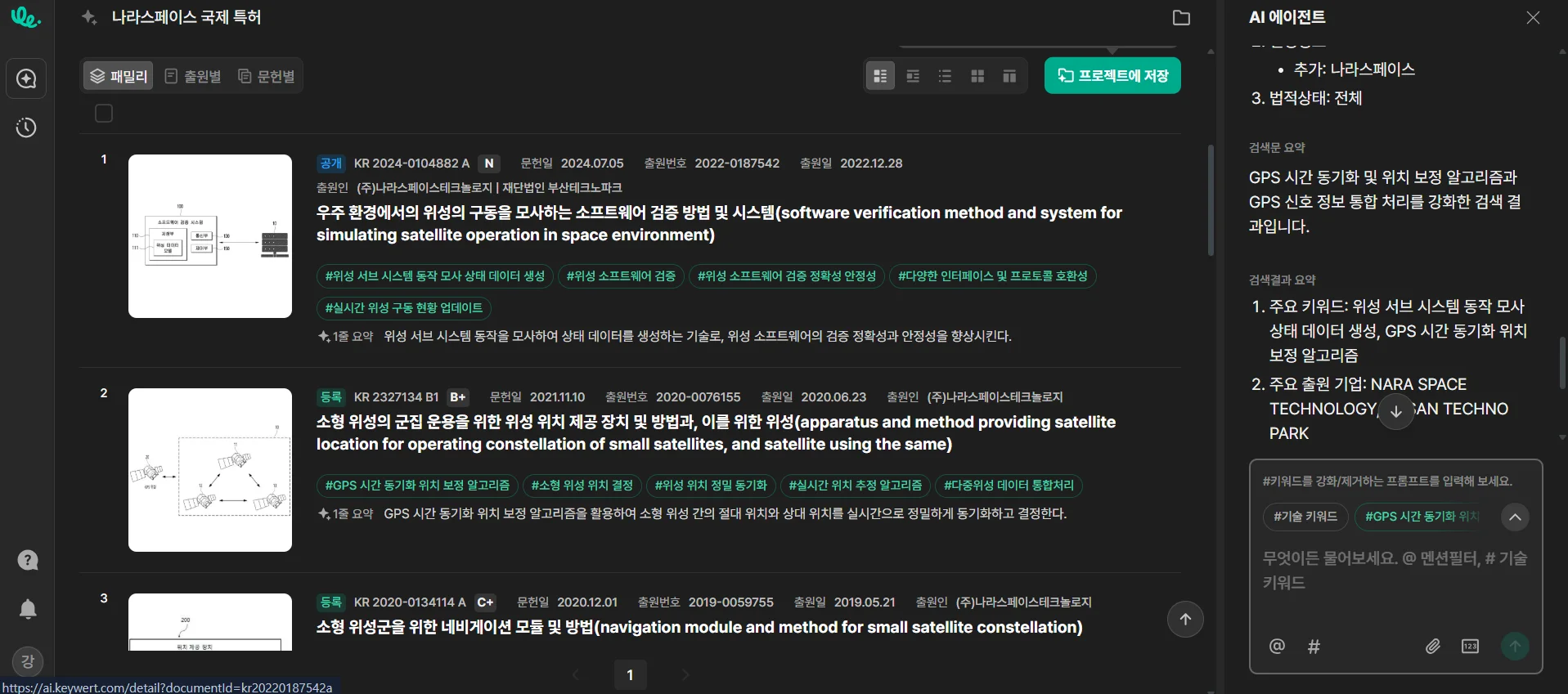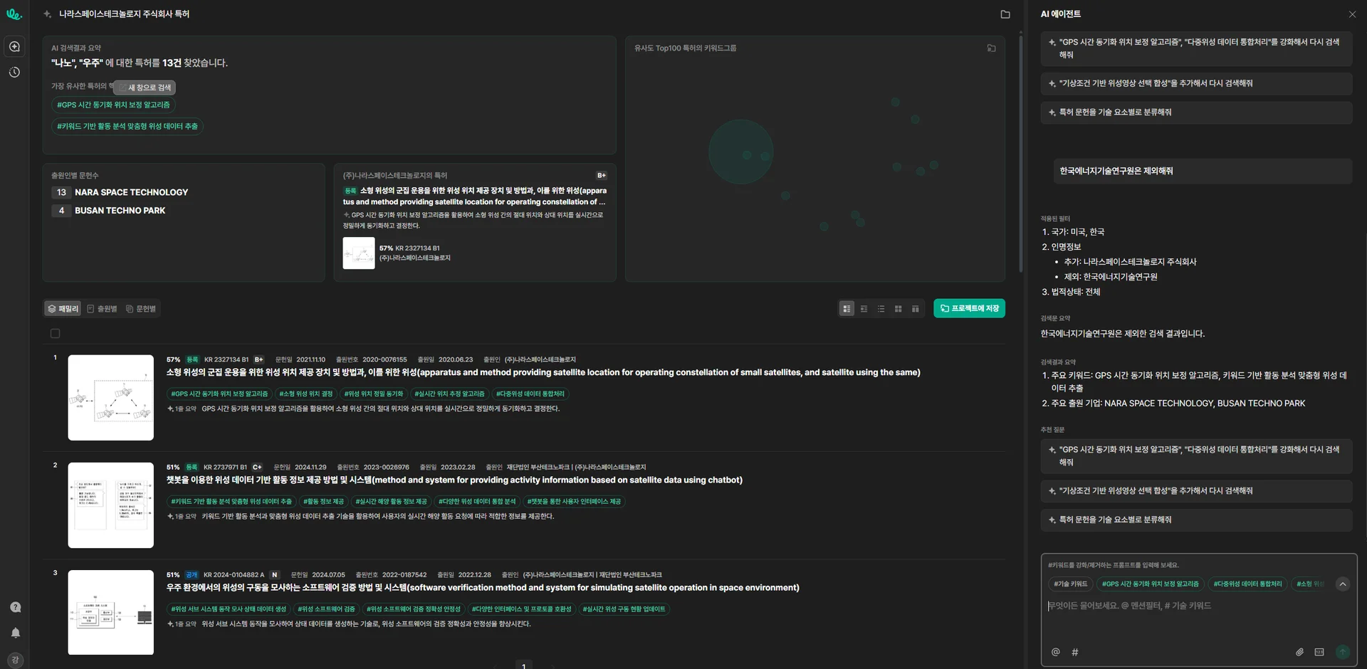 이를 바탕으로 나라스페이스의 특허 포트폴리오를 분석해 봤습니다. 키워트 인사이트를 활용하여 ”한국, 미국, 유럽에서 나라스페이스가 보유한 특허를 찾아줘” 로 간단한 검색으로 다음과 같은 결과가 나왔습니다.