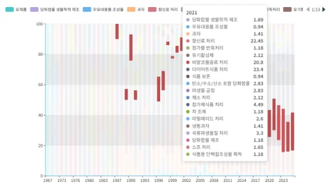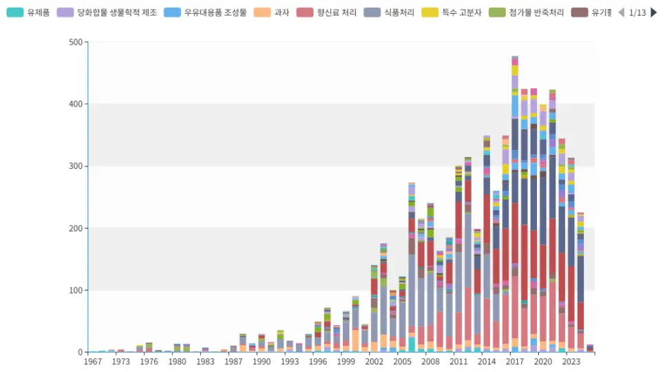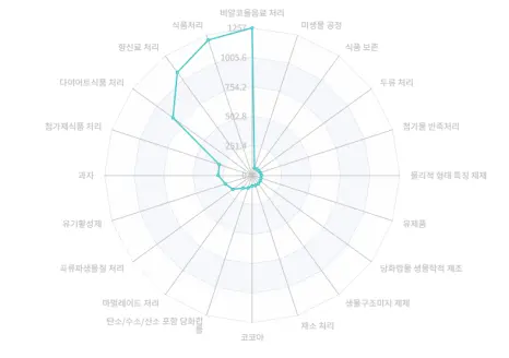 식품처리, 향신료 처리, 비알코올 음료 분야에서 대체당 관련 기술 출원이 활발해졌습니다. 2023년 특허를 기준으로 보면 제로슈거와 건강을 중시하는 트렌드를 반영해
