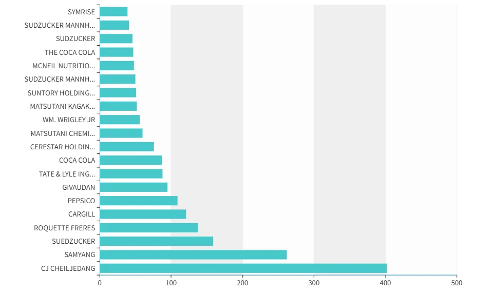 다이어트식품 처리·향신료 처리·비알코올음료 처리가 가장 많은 비중을 차지하는 것을 확인할 수 있습니다. 대체당 관련 특허를 출원인별로 살펴보면, 익숙한 기업들의 이름이 눈에 띄는 것을 확인할 수 있습니다.