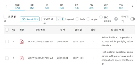이 조합은 단독 감미료로도 사용이 가능하지만 음료나 디저트 등 다른 식품에 섞어서도 활용이 가능하죠. 또한 이 특허는 패밀리 특허만 672건에 달하며, 다른 특허들로부터 인용된 사례(피인용문헌)도 29건이나 됩니다.