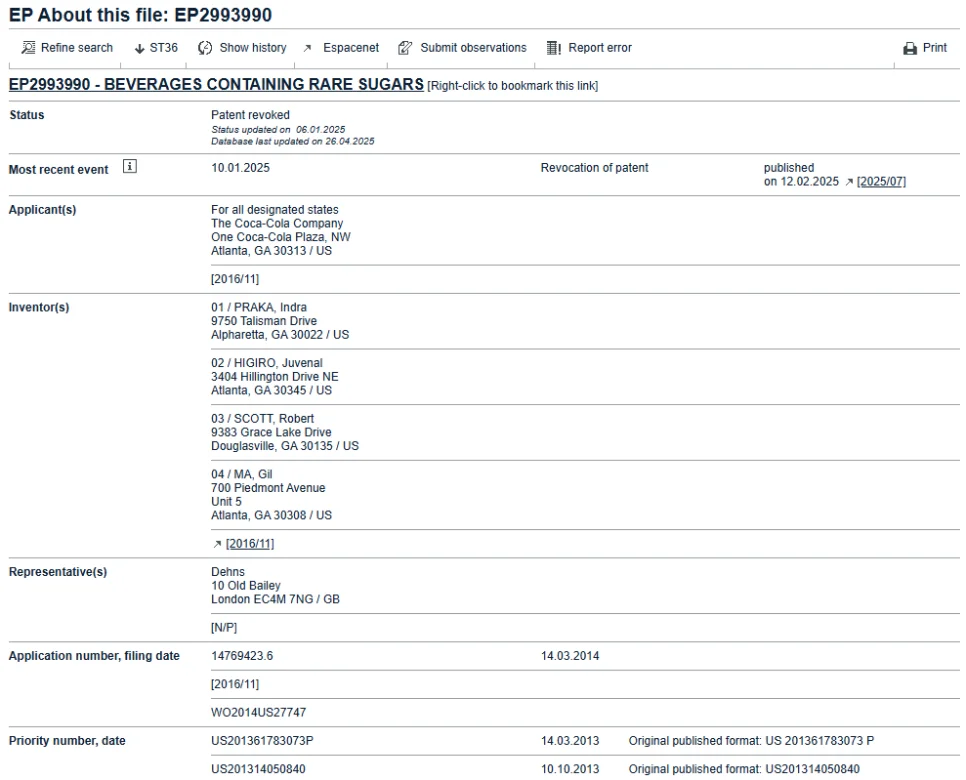 앞서 소개한 특허는 코카콜라가 적극적으로 확보한 핵심기술 중 하나였는데요, 다음은 조금 다른 사례입니다. 바로, 소송에 의해 최종적으로 취소된 특허입니다. EP2993990 A1(Beverages containing rare sugars) 특허는 D-psicos(디-프시코스) 같은 당류와 고효능 감미료를 특정 비율로 조합하여 단맛을 자연스럽게 강화하고, 칼로리를 낮춘 음료를 제조하는 방법에 대한 것입니다.