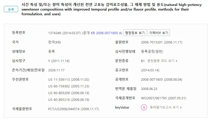 keywert에서는 smart5를 기반으로 비즈니스적인 데이터를 추가한 keyvalue 등급을 제공하고 있습니다. 이번에 소개해드리는 특허는 keyvalue S등급을 받은 특허인데요, 바로 천연 고효능 감미료 중에서도 무칼로리 또는 저칼로리 감미료의 맛을 개선하는 것에 대한 특허, KR 1374346 B1(천연 고효능 무칼로리 또는 저칼로리 감미료 조성물 관련 특허)입니다.