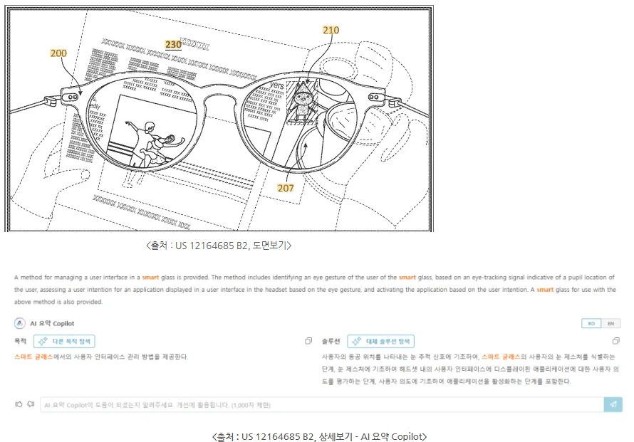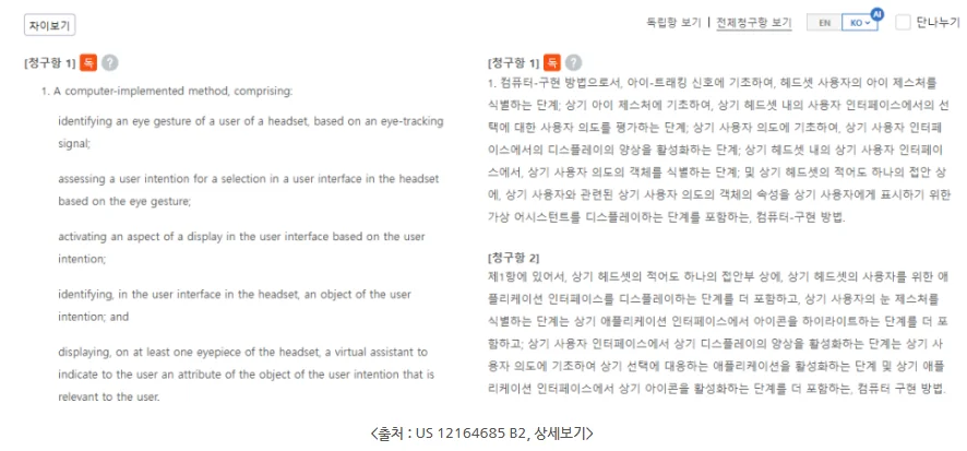예를 들어, 청구항 1번에서 안경에 내장된 눈 추적장치와 디스플레이를 통해 사용자의 시선이동이나 제스처 만으로 의도를 파악하고 이에 따라 인터페이스의 특정 요소를 활성화하거나 가상 도우미를 표시하는 등의 기능을 포함한다는 것을 알 수 있습니다.