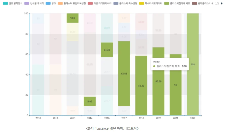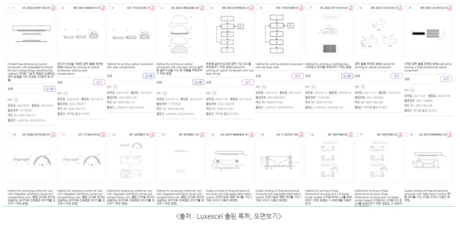 럭섹셀은 3D 프린팅 처방 렌즈와 스마트 렌즈 관련 기술력을 보유한 기업으로 플라스틱 첨가제 제조에 대한 특허를 다수 출원한 것으로 확인할 수 있습니다.