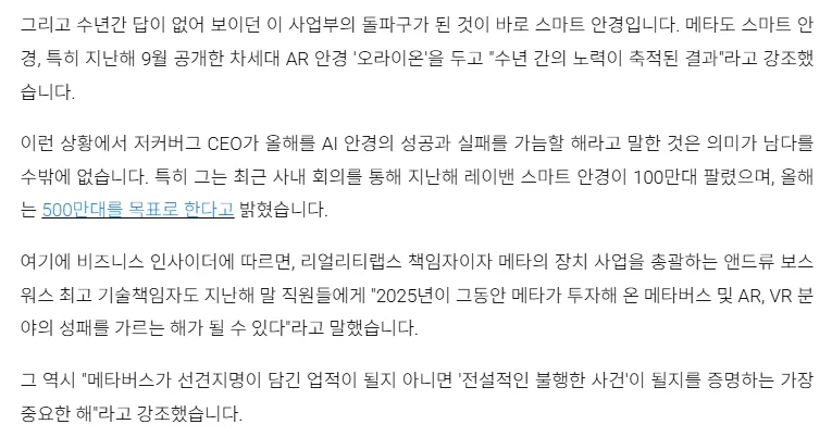 작년 보도에 따르면, 메타는 올해 소형 디스플레이 장착 스마트 안경을 출시할 예정이라고 합니다.