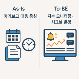 정기 보고 중심의 업무가 지속 모니터링과 시그널 운영 중심으로 전환되면서 보고의 의미가 달라지고 있습니다. 과거에는 분기마다 방대한 리포트를 작성하는 것이 일반적이었습니다. 그러나 이제는 대시보드가 실시간으로 움직이고, 사전에 설정한 임계치를 넘으면 즉시 알림이 발생하여 업무를 이끌어갑니다.