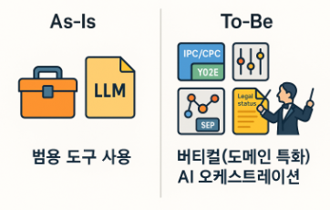 AI 활용 방식도 범용 도구 사용에서 특허에 특화된 도구들을 목적에 맞게 조합하는 방식(버티컬 AI 오케스트레이션)으로 바뀌고 있습니다. 특허 데이터는 IPC/CPC 분류, 패밀리·인용 네트워크, 법적 상태와 같이 매우 복잡하고 전문적인 속성을 가지고 있습니다. 범용 LLM은 문장 생성이나 요약에는 강하지만, 예를 들어 “CPC Y02E”와 같은 복잡한 코드 해석이나 “만료 직전인 경쟁사의 핵심 특허”를 정확히 포착하는 데에는 한계가 있습니다.